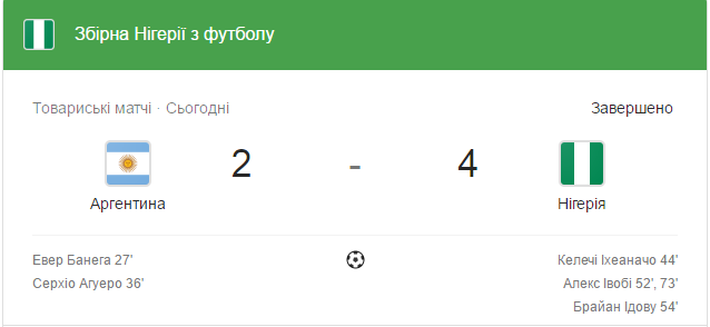 Дубль у нигерийцев оформил Алекс Ивоби (52 и 73), еще по одному голу забили Келечи Ихеаначо (45) и Брайан Идову (57). У аргентинцев отличились Эвер Банега (27) и Серхио Агуэро (36).