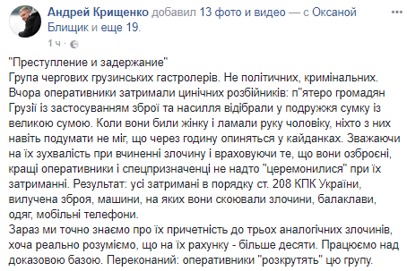 "Учитывая их дерзость при совершении преступления и учитывая то, что они вооружены, лучшие оперативники и спецназ не слишком "церемонились" при их задержании. Результат: все задержаны в порядке ст. 208 УПК Украины, изъято оружие, машины, на которых они совершали преступления, балаклавы, одежда, мобильные телефоны", - написал Крищенко.
