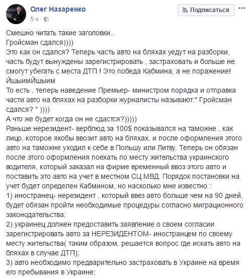 "Раньше нерезидент- "верблюд" - за 100$ показывался на таможне, как лицо, которое якобы ввозит авто "на бляхах", и после его оформления на таможне уходил к себе в Польшу или Литву. Теперь он будет обязан после оформления поехать по месту жительства украинского водителя, который заказал на фирме временный ввоз этого авто, и поставить его на учет в местном СЦ МВД", - поясняет генеральный директор Всеукраинской ассоциации автоимпортеров и дилеров Олег Назаренко на своей странице в Facebook.