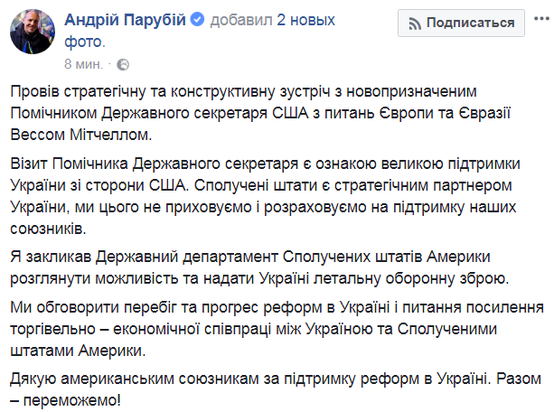 Парубий призвал власти США предоставить летальное оборонительное оружие. Также, по его словам, на встрече обсуждали ход реформ в Украине и вопросы торгово-экономического сотрудничества с США.
