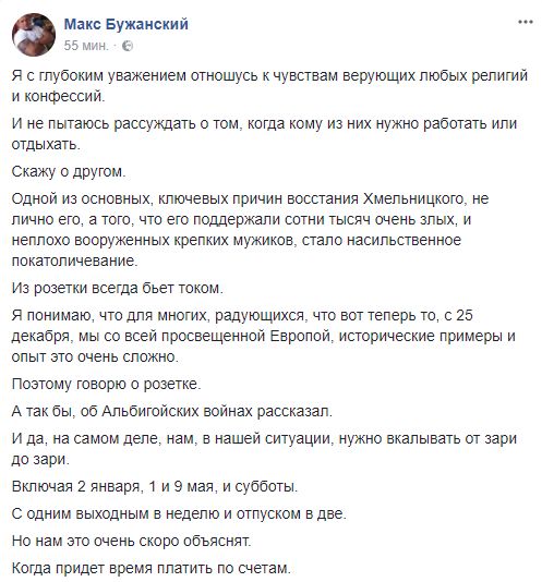 "Я с глубоким уважением отношусь к чувствам верующих любых религий и конфессий. И не пытаюсь рассуждать о том, когда кому из них нужно работать или отдыхать. Скажу о другом.