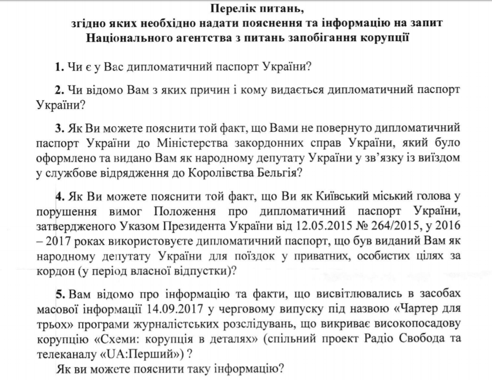 После этого ведомство и мэр вступили в переписку. Кличко потребовал у НАПК прислать ему вопросы, которые интересуют антикоррупционеров. В распоряжении "Страны" оказалось письмо НАПК со списком этих вопросов.