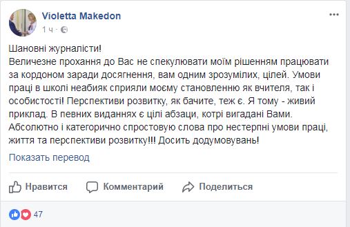 "Уважаемые журналисты! Огромная просьба к Вам не спекулировать моим решением работать за границей ради достижения, вам одним понятных целей. Условия труда в школе немало способствовали моему становлению как учителя, так и личности! Перспективы развития, как видите, тоже есть. Я тому - живой пример. В некоторых изданиях есть целые абзацы, которые выдуманы Вами. Абсолютно и категорически опровергаю слова о невыносимых условиях труда, жизни и перспективах развития! Хватит домыслов!", - написала она в Facebook.