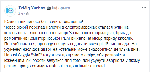 "Южный остался без воды и отопления! Из-за резкого перепада напряжения в электросетях произошла остановка котельной и насосной станции. По нашей информации, бригада ремонтников Коминтерновского РЭС выехала на место порыва кабеля. Предполагается, что воду начнут подавать вечером 16 ноября. На устранение аварии на котельной может понадобиться несколько дней ", - говорится в сообщении.