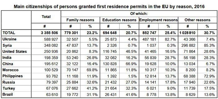 Отмечается, что что Украина лидирует по числу переселенцев в ЕС уже несколько лет подряд. В 2015 году гражданам Украины было выдано 500 тысяч разрешений на проживание, в 2014 году - почти 303 тысячи, в 2013 - около 237 тысячи.