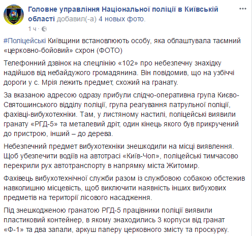 Специалисты обезвредили гранату и временно перекрыли движение на автодороге "Киев-Чоп" в направлении Житомира. Кроме этого, неподалеку был найден пластиковый контейнер, в котором находились 3 корпуса от гранат "Ф-1" и два запала, лист бумаги церковного содержания и две просфоры (специальный церковный хлеб, используемый во время богослужений в православии).