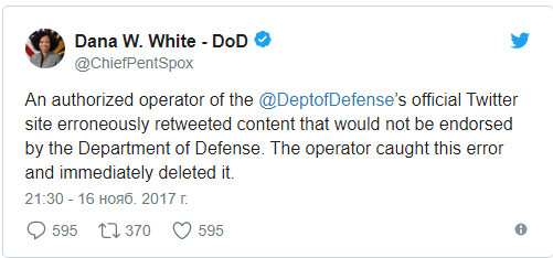 "Оператор официального аккаунта @DeptofDefense в Twitter по ошибке ретвитнул контент, который не одобрило бы Министерство обороны. Оператор заметил эту ошибку и сразу же ее удалил", – пояснила она.
