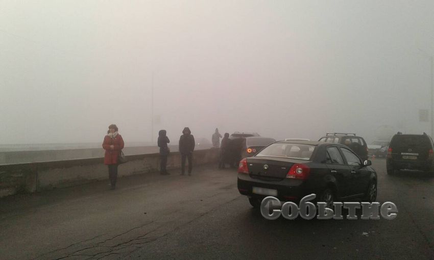 Из-за ДТП проезд по мосту ограничен, здесь образовалась пробка. Полицейские выясняют подробности ДТП, водители в замешательстве, из-за плохой видимости некоторые путаются в показаниях.