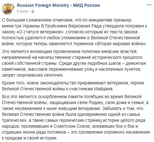 "С большим сожалением отмечаем, что по инициативе премьер-министра Украины Гройсмана Верховная Рада утвердила поправки к закону "О статусе ветеранов", согласно которым из текста закона полностью удаляется любое упоминание о Великой Отечественной войне, которое теперь заменяется термином "Вторая мировая война", - отметили в ведомстве.
