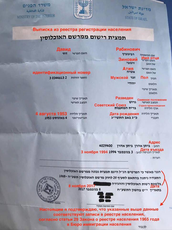 Блогер Василий Крутчак опубликовал копии документов из МВД Израиля, где Рабинович зарегистрировался еще в 1994 году, когда репатриировался вместе с женой. Потом ей и детям дали гражданство, автоматически израильский паспорт выдали и Рабиновичу.