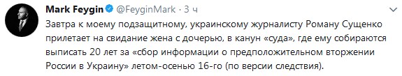 "Завтра к моему подзащитному, украинскому журналисту Роману Сущенко прилетает на свидание жена с дочерью, накануне "суда", где ему собираются выписать 20 лет за "сбор информации об ориентировочном вторжении России в Украину" летом-осенью 16-го (по версии следствия)", - написал Фейгин.