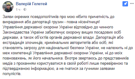 Заявления отдельных псевдополитиков о моей якобы причастности к похищению или депортации грузин - полная чушь!", - написал Гелетей.