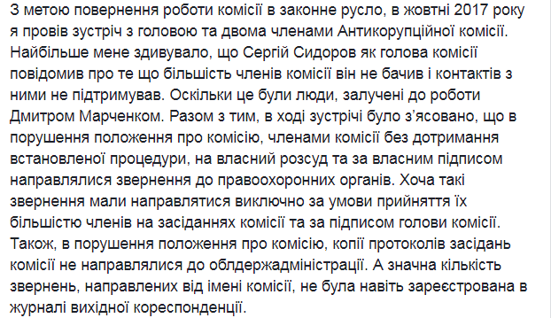 "Со временем, в деятельности комиссии начали доминировать субъективизм и сведения личных и деловых интересов тогдашнего руководителя комиссии Дмитрия Марченко. Поскольку фактически комиссия была преобразована в инструмент бизнес "разборок", весной 2017 были изменены руководителя комиссии. И вместо Дмитрия Марченко комиссию возглавил запорожский журналист Сергей Сидоров", - пишет председатель Запорожской облгосадминистрации.