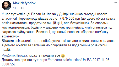"Победитель отдал за лот 7 875 000 грн (до этого объект несколько раз пытались продать по более высокой цене, но безуспешно). По словам искусствоведов, здание - шедевр конструктивизма, который оказался под угрозой разрушения. Уверены, что новый владелец сохранит памятник архитектуры", - написал Нефедов и поздравил всех активистов, которые волновались за судьбу известного объекта.