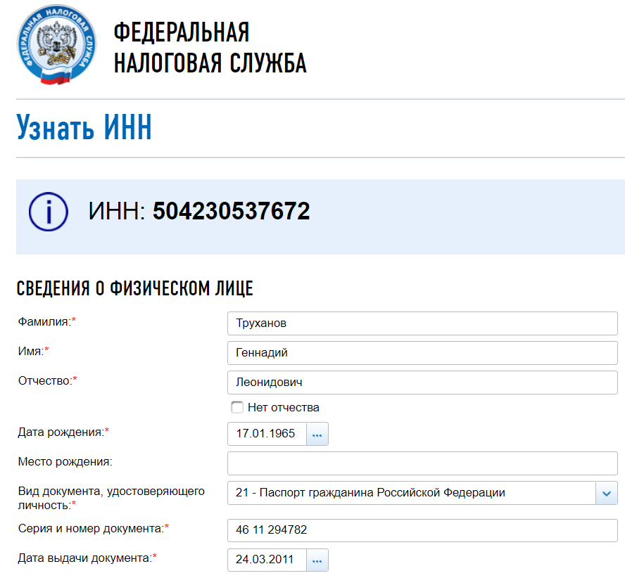 Операцию при желании может повторить каждый. Если ввести в форму предполагаемый номер паспорта, ФИО и дату рождения одесского мэра, то система находит конкретный ИНН, который подходит под указанные данные.
