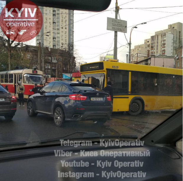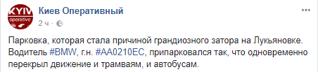 Во вторник, 21 ноября, на Лукьяновской площади возник затор из-за неправильно припаркованного BMW. Об этом сообщает "Киев Оперативный" в Facebook.