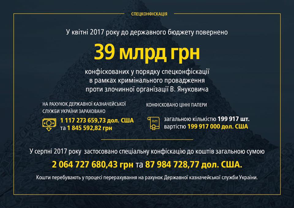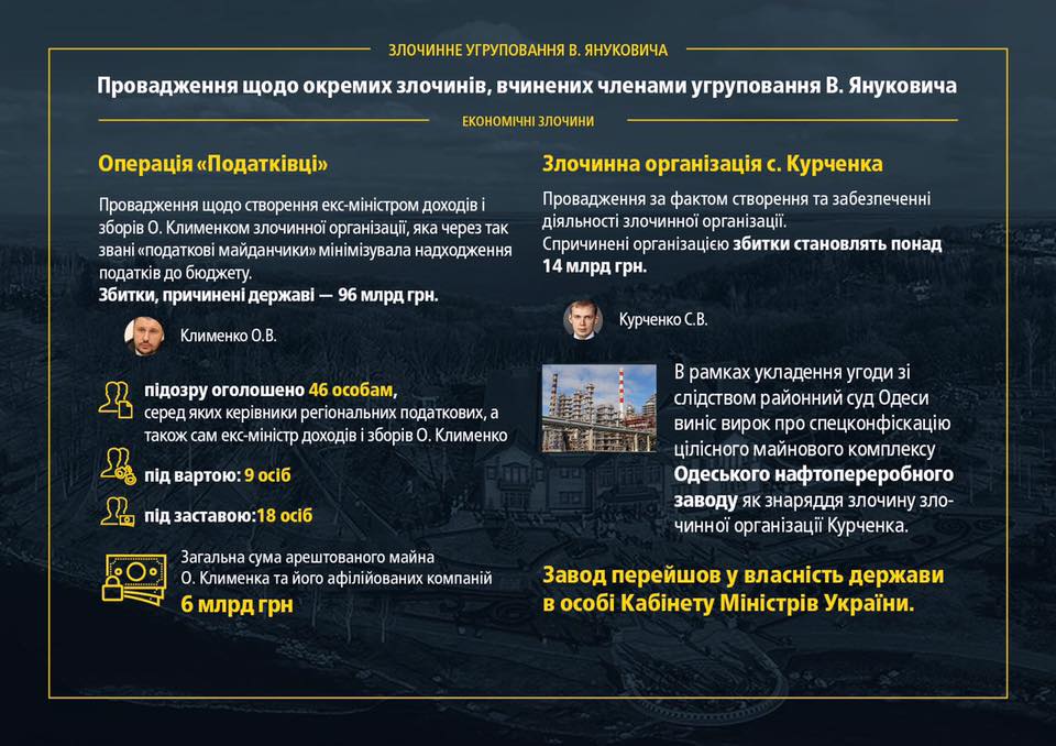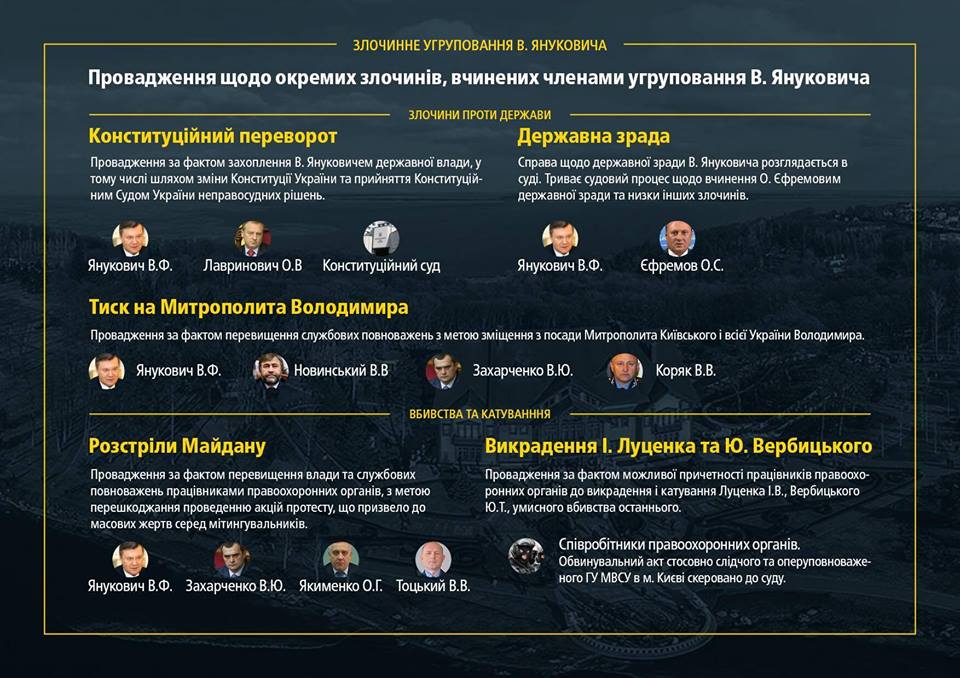 "Дело о госизмене Януковича – в суде, дело о сепаратизме Ефремова – в суде, дело о преступном приказе о расстреле демонстрантов по Януковичу, Захарченко, Якименко, Тоцкому – в суде", – добавил генпрокурор.