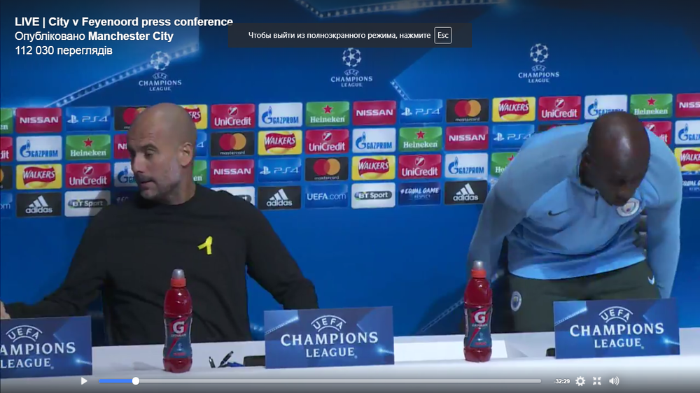 Лига чемпионов. Тренер Манчестер Сити пришел на пресс-конференцию с желтой ленточкой, в знак поддержки политузников Каталонии
