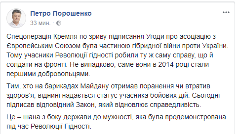 "Тем, кто на баррикадах Майдана получил ранения или потерял здоровье, отныне предоставляется статус участника боевых действий. Сегодня подписал соответствующий закон, восстанавливающий справедливость", - написал Порошенко.