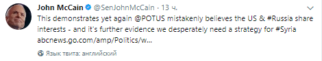 "Трамп ошибочно полагает, что США и Россия разделяют общие интересы, и это ещё одно доказательство того, что нам отчаянно нужна стратегия по Сирии", - говорится в сообщении сенатора и последовательного противника Владимира Путина.