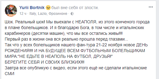 После этого Юрий порекомендовал в Facebook не ездить на футбол в Неаполь - "конченый город в плане болельщиков" и пообещал сам больше его не посещать.