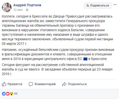 "Коллеги, сегодня в Брюсселе во Дворце Правосудия рассматривалась апелляционная жалоба экс-заместителя Генерального прокурора Украины Баганца на обвинительный приговор о признании его виновным в нарушении Уголовного кодекса Бельгии, совершении преступления и назначении ему наказания в виде штрафа и одного месяца тюремного заключения, объявленный судом первой инстанции 08 марта 2017 г.", - сообщил Портнов.