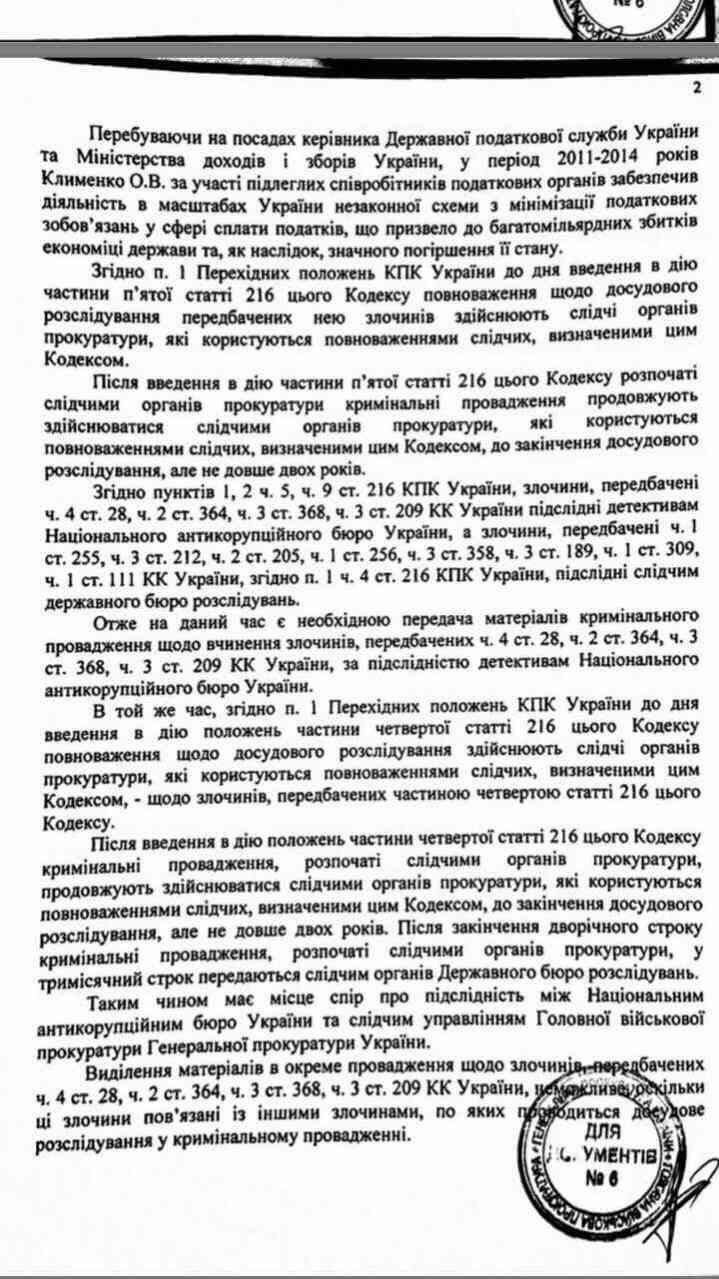 Из его текста следует, что на Резницкой признают факт утраты следственных полномочий сотрудниками органов прокуратуры (в том числе и военной), после 20 ноября по делу Клименко, фигурантам которого вменяется создание и работа налоговых площадок, в результате деятельности которых бюджету был нанесен ущерб в размере 96 млрд. грн.
