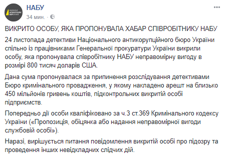 "24 ноября детективы НАБУ совместно с работниками Генпрокуратуры Украины разоблачили лицо, предлагала сотруднику НАБУ неправомерную выгоду в размере 800 тысяч долларов США", - говорится в сообщении.