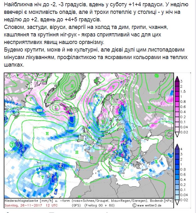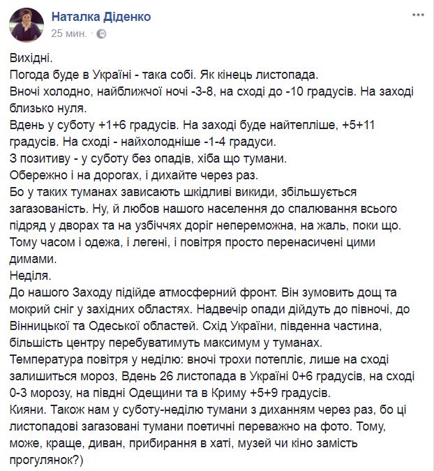 "Днем в субботу + 1 + 6 градусов. На западе будет теплее, + 5 + 11 градусов. На востоке - холоднее -1-4 градуса. Из позитива - в субботу без осадков, разве что туманы. Осторожно и на дорогах, и дышите через раз. Поскольку в таких туманах зависают вредные выбросы, увеличивается загазованность. Ну, и любовь нашего населения к сжиганию всего подряд во дворах и на обочинах дорог непобедима, к сожалению, пока. Поэтому время и одежда, и легкие, и воздух просто перенасыщены этими дымами", - пишет синоптик.