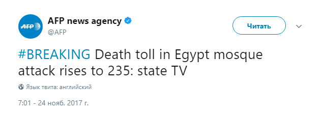 В Египте уже как минимум 234 погибших в результате теракта в мечети на севере Синайского полуострова. Ранее сообщалось о 184 погибших. Шокирующие цифры приводит AFP в Twitter.