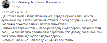 В понедельник, 27 ноября, в 06:30 на трассе Львов - Ивано-Франковск произошло ДТП, из-за которого образовался масштабный затор. Об этом в Facebook сообщает депутат Львовского горсовета Игорь Зинкевич.
