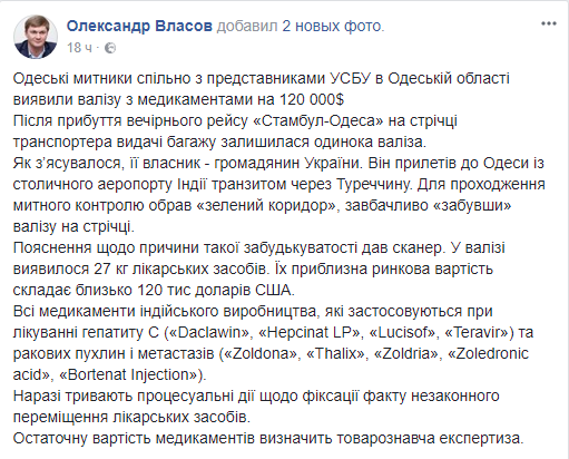 В Одесском аэропорту задержали крупную партию контрабандных лекарственных средств на $120 тысяч. Об этом сообщает глава Одесской таможни Александр Власов в Facebook.