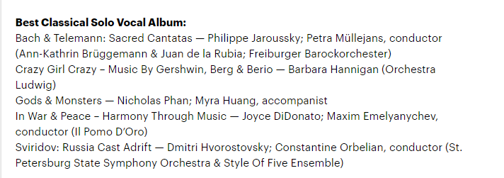 Его номинировали за запись поэмы Георгия Свиридова "Отчалившая Русь". Запись была сделана исполнителем вместе с дирижером Константином Орбеляном и Санкт Петербургским государственным симфоническим оркестром.