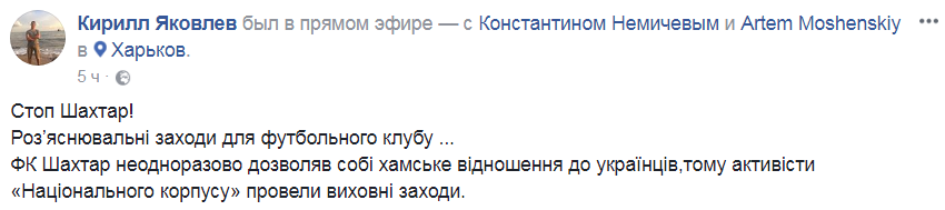 Вечером вторника, 28 ноября представители националистов "Нацкорпуса", а также групп "Kharkiv City Patriots" и "The Club", остановили автобус с чемпионами Украины и единственными представителями страны в Лиге Чемпионов - игроками "Шахтера".