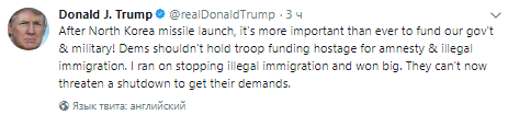 "После ракетного запуска КНДР сейчас важно как никогда финансировать наше правительство и бюджет. Демократы не должны держать финансирование войск в заложниках за амнистию и незаконную иммиграцию. Я победил на обещаниях остановить незаконную иммиграцию. Они сейчас угрожают закрытием (правительства - Прим.Ред.), чтобы добиться своего", - написал президент США.