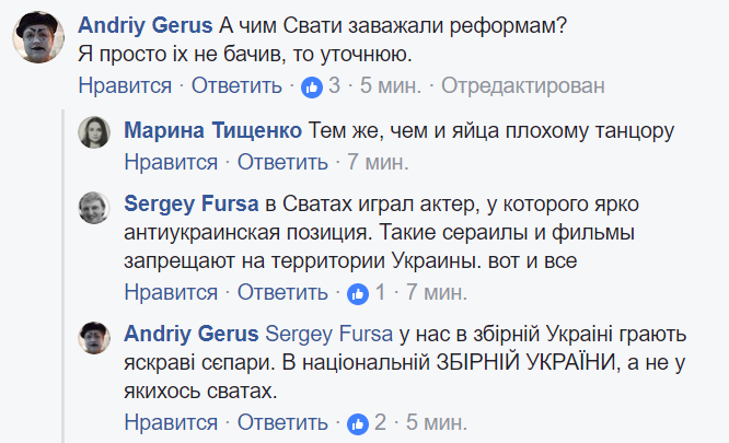 При этом под постом у Фурсы разгорелась дискуссия с политологом Андреем Герусом. Тот заявил, что странно запрещать сериал, когда в даже в сборной Украины играют "сепары".
