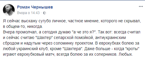 "Я сейчас выскажу сугубо личное, частное мнение, которого не скрывал, в общем-то, никогда. Вчера промолчал, а сегодня думаю - "А че это я?". Так вот: всегда считал и сейчас считаю "Шахтер" сепарской помойкой, антиукраинским сбродом и надутым через соломинку проектом. В еврокубках болею за любой украинский клуб, кроме "Шахтера". Даже больше - когда "кроты" играют еврокубковый матч, всегда болею за их соперников. Любых", - написал Чернышев.