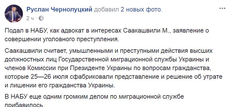 "Подал в НАБУ, как адвокат в интересах Саакашвили, заявление о совершении уголовного преступления", - написал Чернолуцкий.