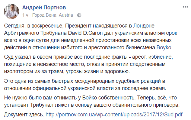 В воскресенье, 3 декабря, президент Арбитражного Трибунала Дэвид Д. Карон дал украинским властям срок всего в одни сутки для немедленной приостановки всех незаконных действий в отношении избитого и арестованного бизнесмена Игоря Бойко.