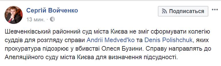 Шевченковский районный суд города Киева не смог сформировать коллегию судей для рассмотрения дела об убийстве Олеся Бузины. Об этом сообщает адвокат подозреваемых Сергей Войченко.