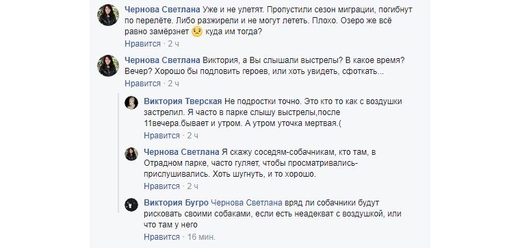 "В парке убивают уже уток. Как так можно - застелить живое создание..." - написала Виктория Тверская.