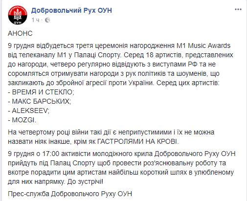 "На четвертом году войны такие действия недопустимы и их нельзя назвать никак иначе, кроме как гастроли на КРОВИ. 9 декабря в 17:00 активисты молодежного крыла Добровольческого Движения ОУН придут под Дворец Спорта чтобы провести разъяснительную работу и еще раз посоветовать этим артистам наиболее короткий путь в любимом для них направлении. До встречи!", - говорится в сообщении.
