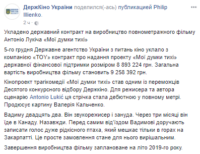Госагенство по вопросам кино подписало контракт с компанией ТОY на производство полнометражного фильма "Мои мысли тихие". Об этом сообщает пресс-служба Госкино в Facebook.