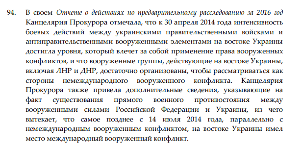 "Канцелярия Прокурора также привела дополнительные сведения, указывающие на факт существования прямого военного противостояния между вооруженными силами Российской Федерации и Украины, из чего следует, что самое позднее с 14 июля 2014 года, параллельно с немеждународным вооруженным конфликтом, на востоке Украины имел место международный вооруженный конфликт", - говорится в докладе.