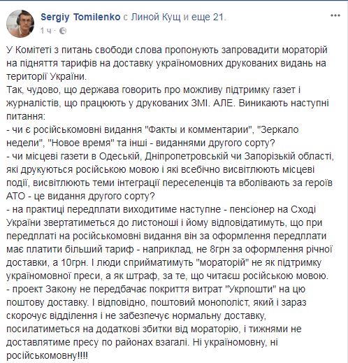 Томиленко считает, что на практике будет получаться, что пенсионер на Востоке Украины будет обращаться к почтальону и ему ответят, что при подписке на русскоязычные издания он за оформление подписки должен платить больший тариф - например, не 8 грн за оформление  доставки, а 10 грн. "И люди будут воспринимать "мораторий" не как поддержку украиноязычной прессы, а как штраф, за то, что читаешь на русском языке", - считает глава НСЖУ.