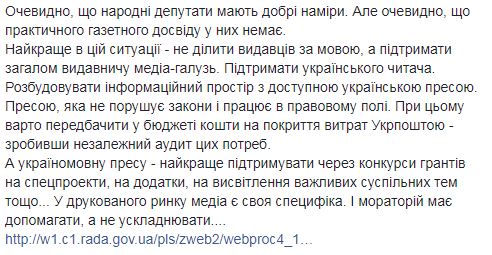 В этой ситуации Томиленко предлагает не делить издателей по языку, а поддержать в целом издательскую медиа-отрасль. "Поддержать украинского читателя. Развивать информационное пространство с доступной украинской прессой. Прессой, которая не нарушает законы и работает в правовом поле. При этом стоит предусмотреть в бюджете средства на покрытие расходов Укрпочты - сделав независимый аудит этих потребностей", - отмечает он.
