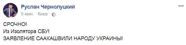 Адвокат задержанного Михаила Саакашвили - Руслан Чернолуцкий опубликовал его обращение из изолятора СБУ.