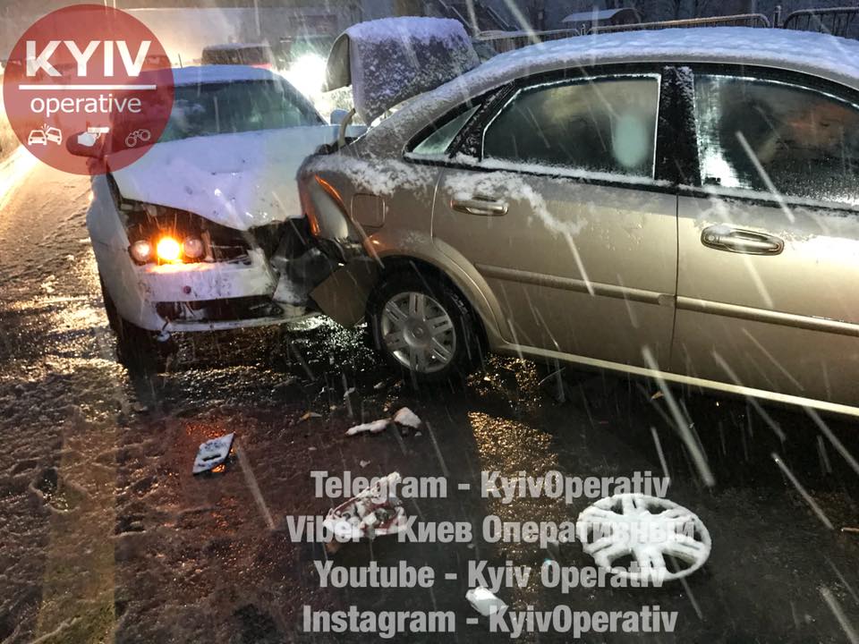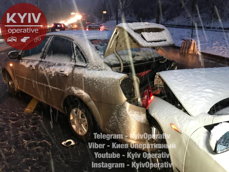 Тройная авария и сильный снег парализовали движение на Елены Телиги в Киеве