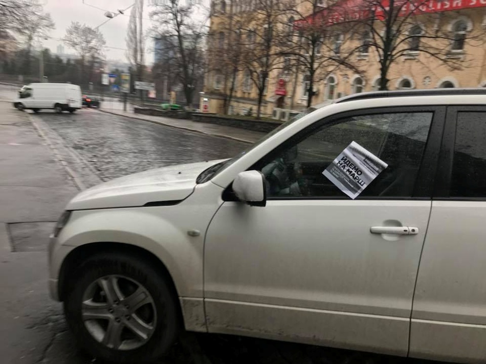 В центре Киева активисты марша за импичмент президента обклеили припаркованные автомобили листовками. Об этом сообщают водители в паблике "Киев Автомобильный" в Facebook.