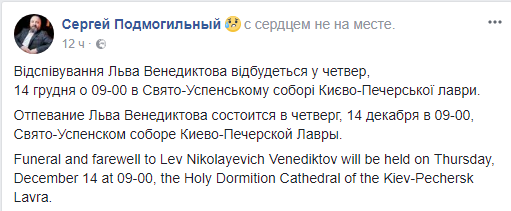 Отпевание хормейстера и народного артиста Украины состоится в четверг, 14 декабря в 09:00 в Свято-Успенском соборе Киево-Печерской Лавры.